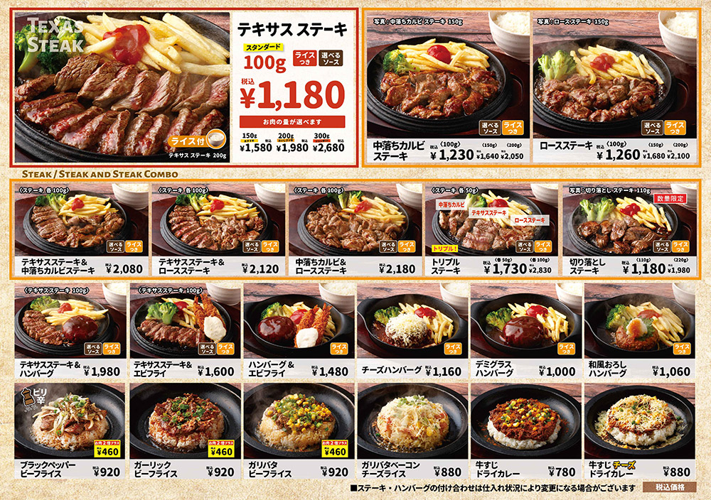 ボリューム感あるステーキをフードコートでお召し上がりいただけます。 看板商品「テキサスステーキ」はお肉の量が4段階、ソースは5種類をご用意。 その他にも、ハンバーグ、ご飯とお肉を使ったライスメニューなどファミリーでもご利用いただきやすいお店です。